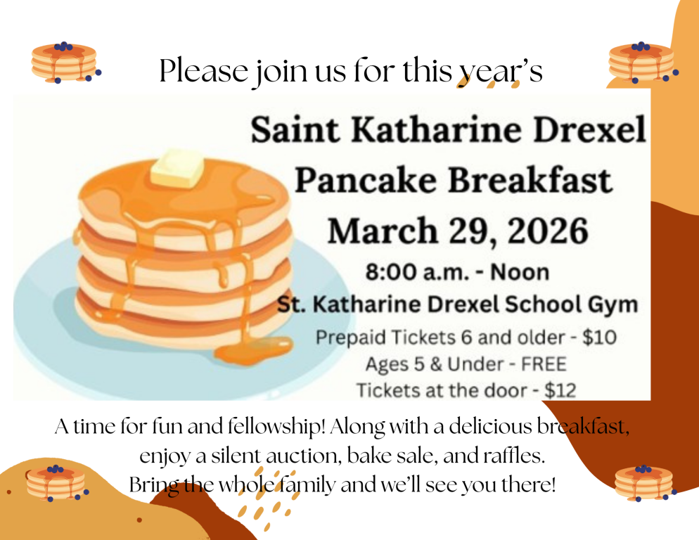 The annual Saint Katharine Drexel Pancake Breakfast combined with a Silent Auction is held in March. We invite you to consider supporting the parish and school through a monetary donation, or an item for the Silent Auction. Silent Auction items could consist of gift certificates, themed baskets of goodies, handcrafted goods or other newly purchased items of our choice. All sponsors will be promoted at the event. This event helps support the SKDS Band, an important part of the SKDS mission to "teach the whole child." All school, parish members, and students are encouraged to work at this important and popular community event.